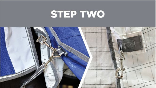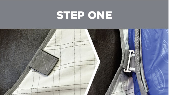 First, place your liner on your horse followed by your turnout rug. Undo the two or four touch tape tabs at the neck of your liner and fold them through the liner attachment ring on your turnout rug. Secure the touch tape back to the liner.